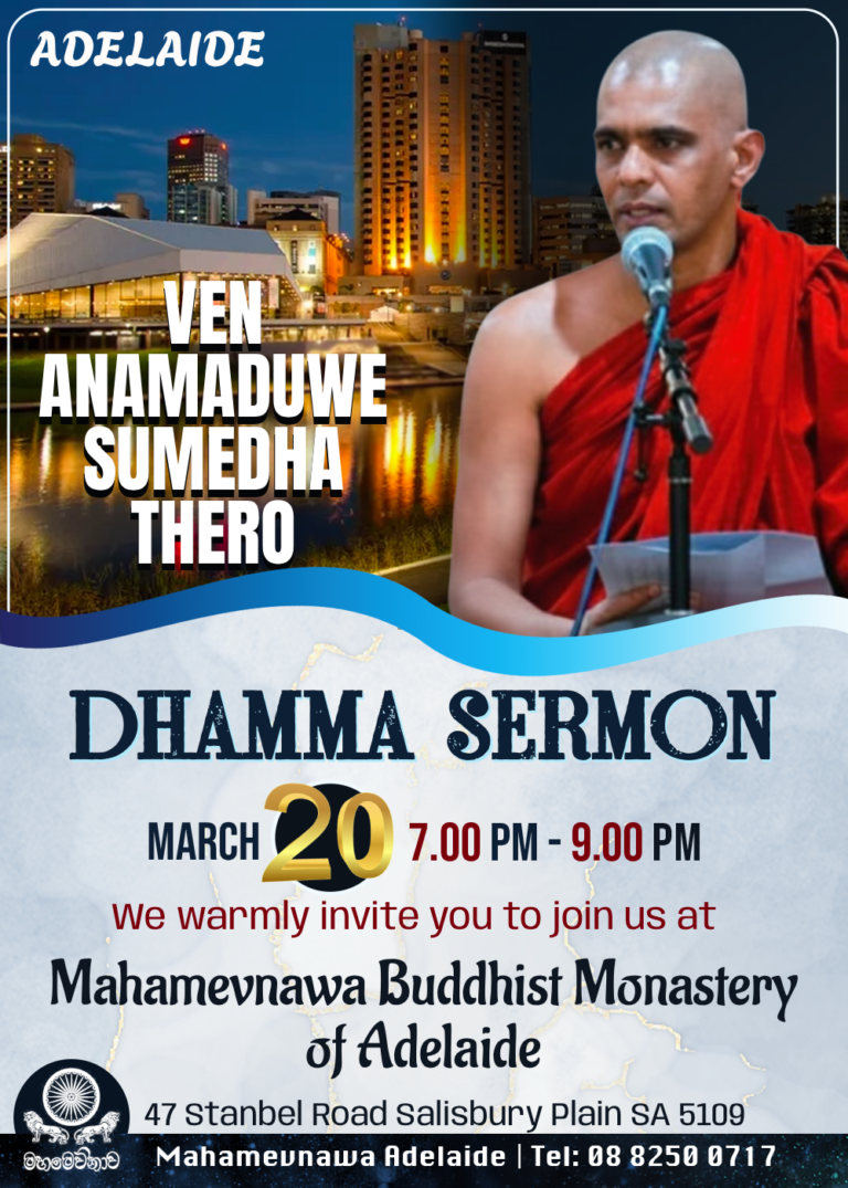 Weekly Dhamma sermon is held every Saturday (Except 2nd Saturday) from 7.00 pm – 9.00 pm at the Mahamevnawa Buddhist Monastery of Adelaide